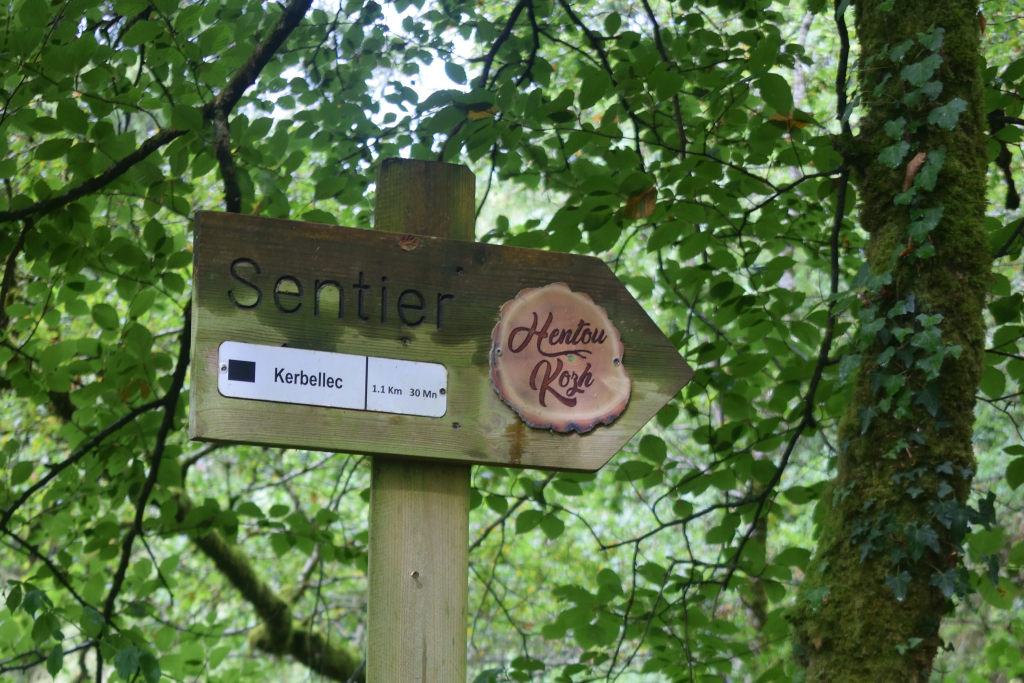 Après environ 200 mètres, prenez à droite en direction du village de Kerbail, puis, à son entrée, empruntez le premier chemin descendant sur la gauche.