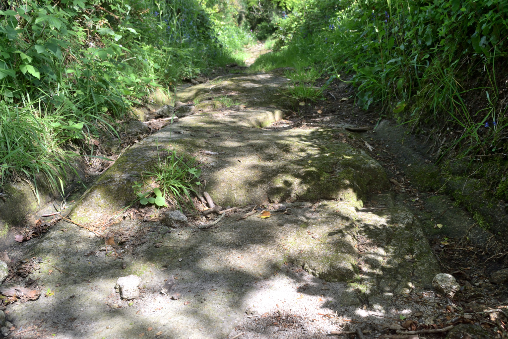 Dans ce massif granitique où affleure le sol, les charrettes du Moyen Âge ont laissé des empreintes profondes et indélébiles. La distance de 120 cm entre les traces de roues, ainsi que la présence de murs en grosses pierres de chaque côté, indiquent que ce chemin date du Moyen Âge et non de l'époque romaine.