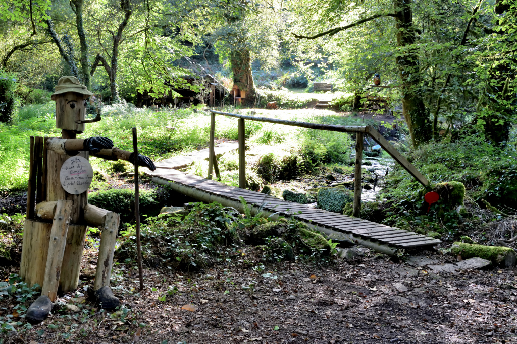 Vous arrivez au "Petit Paradis", où Jobic vous attend. Ici, des moulins à eau, des sculptures d'animaux, des jeux en bois, des nids, et bien d'autres merveilles sont l'œuvre des deux amis, Bertrand et Alain.