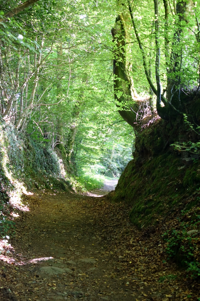 Un joli chemin creux, bordé de hauts talus boisés, descend dans le vallon. Prenez à gauche, puis à droite après environ 100 mètres, en passant sous la voie rapide Lorient-Roscoff. Ensuite, la montée s’avère un peu sportive.