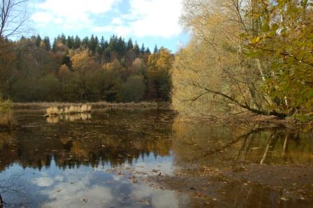 Au fond de la queue de l'étang des plots d'herbe touffues envahissent l'étendue d'eau, permettant à des couples de canards col vert de s'y réfugier.
