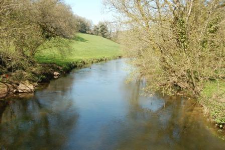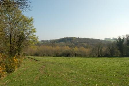 Le village de Kernou surplombe le vallon où coule un ruisseau longé par le chemin encaissé.