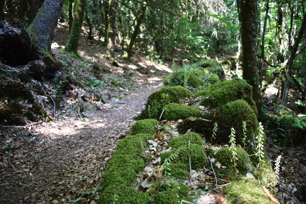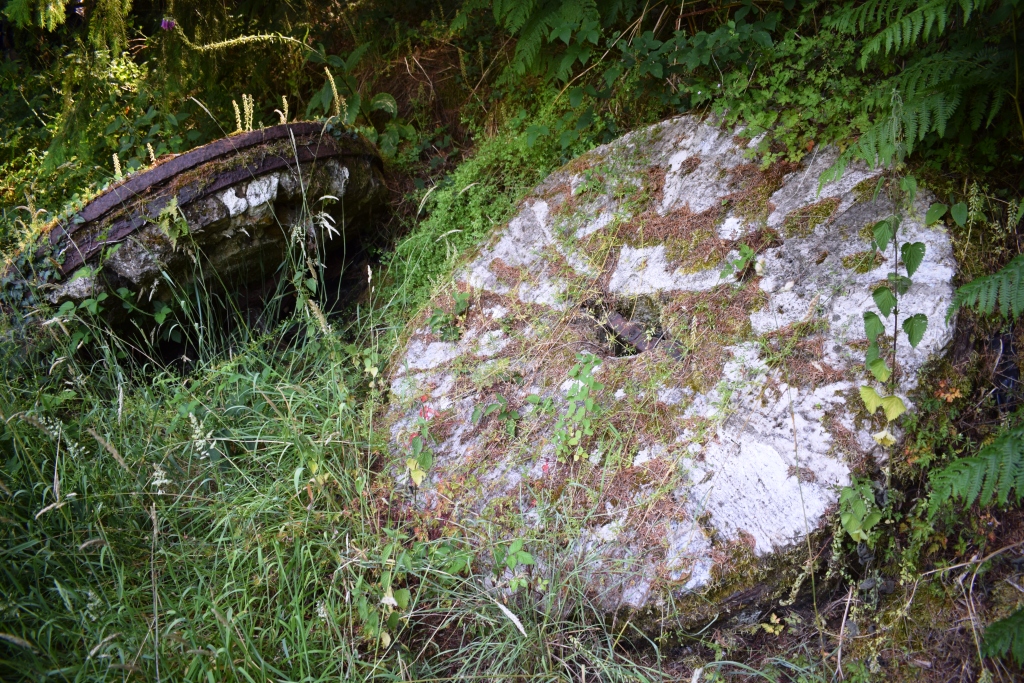 Les vestiges du moulin de Bodéry avec ses meules sur la gauche du sentier.