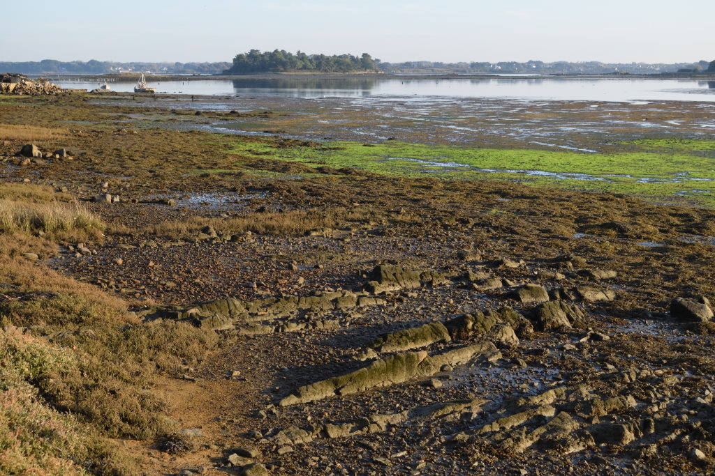 La Pointe de la Vieille Chapelle offre un panorama exceptionnel. On aperçoit Belz, le clocher du bourg de Locoal-Mendon, et les nombreuses exploitations ostréicoles.