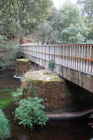La passerelle en bois recouvre les 2 piliers de pierre, témoins du pont disparu après les crues de 2000. Probablement bâti avant 1800, il assurait une liaison entre le bourg de Guilligomarc'h et celui de Plouay.
