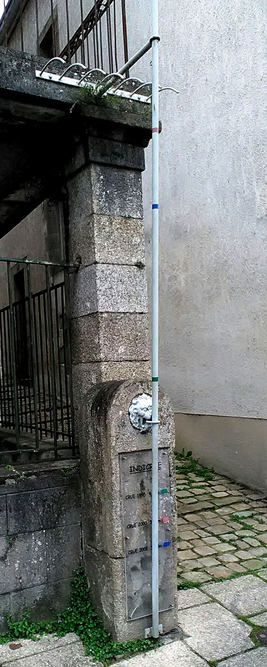 Au numéro 9, sur la gauche du café Brizeux, un bâton témoin montre les principales grandes crues: 1995, 2000 et 2002. Le record est battu en décembre 2000 avec un niveau approchant les 6 mètres.