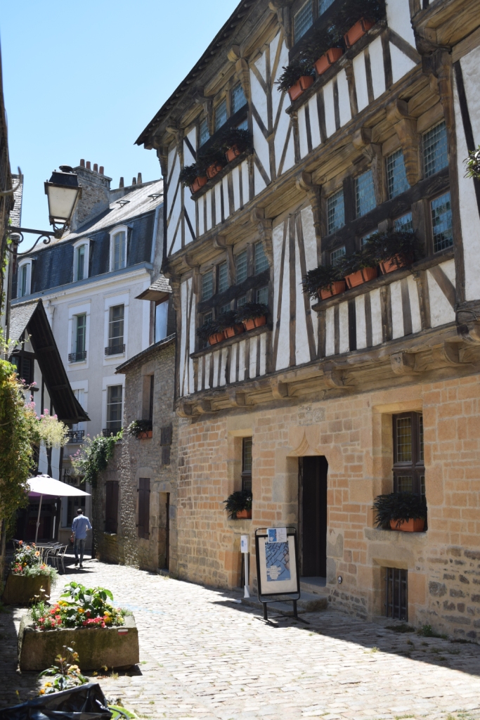 Au premier plan sur la photo, la maison à pans de bois la plus ancienne datée de Bretagne : 1394. Elle a accueilli pendant plusieurs générations la crêperie/épicerie Ty Coz, connue de tous les Quimperlois. Aujourd'hui elle laisse la place à un salon de thé.