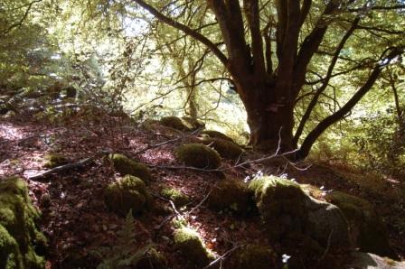 Après environ 1,2 km lors de la descente au lieu de poursuivre le chemin, prendre tout droit un sentier abrupt dans le bois jusqu'au ruisseau. Le tumulus, où fut découvert une chambre à tombe, est situé au bord de l'autre rive.