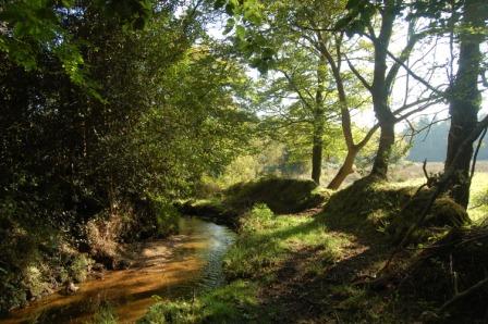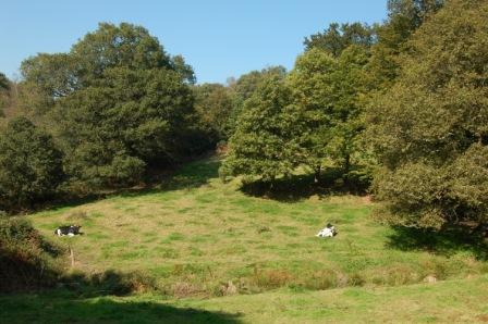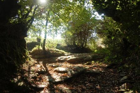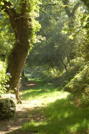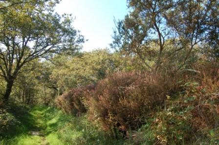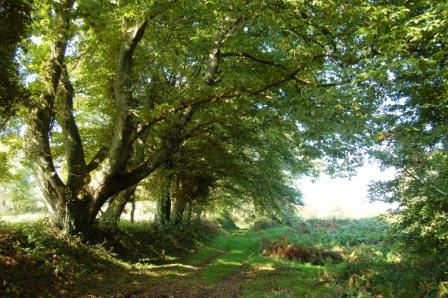 Un peu plus loin après la maison en ruine, tournez sur votre gauche, puis sur la droite 2 fois pour faire le petit crochet dessiné sur la carte. A la fin de celui-ci vous descendez un chemin encaissé et boisé qui est sur la photo de gauche.